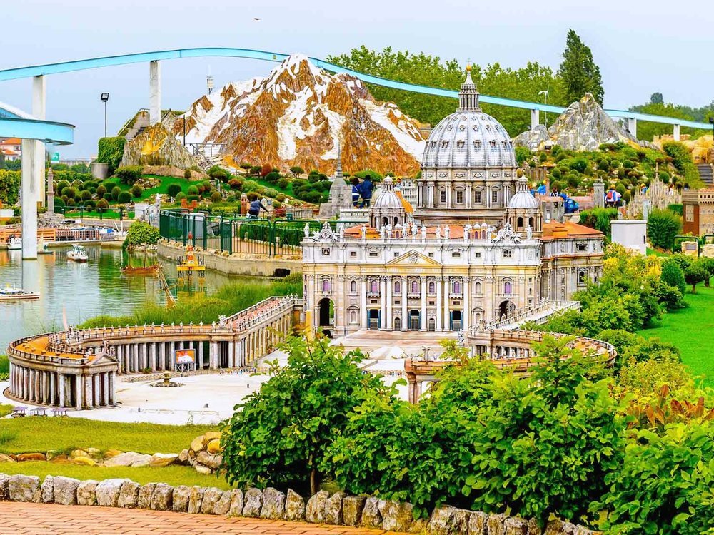 Miniatűr vidámpark, Olaszország és Európa leghíresebb 273 műemlékének és épületének kicsinyített mása látható.