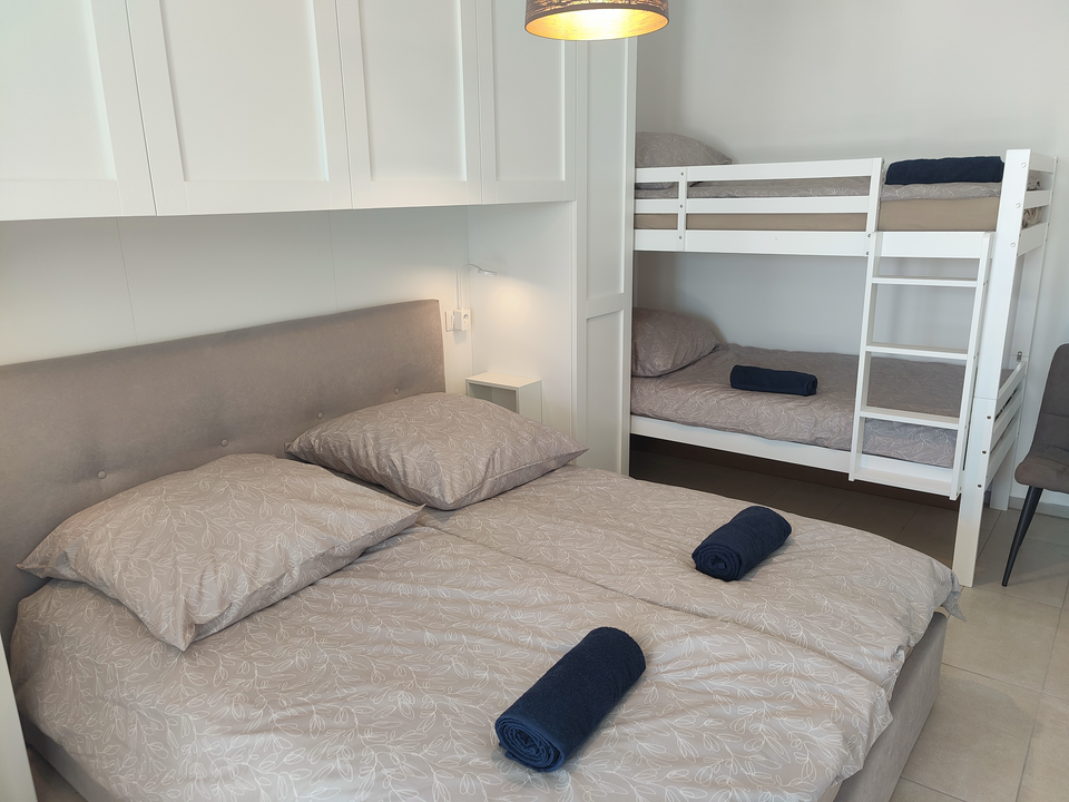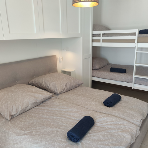 Kétszemélyes franciaágy és nagyméretű fa emeletes ágy van mindkét szobában, így szobánként 2 felnőtt és 2 gyerek, vagy 3 felnőtt és 1 gyerek tud aludni. A gyerekek szinte mindig azon versenyeznek, hogy ki alszik fenn az emeletes ágyon.