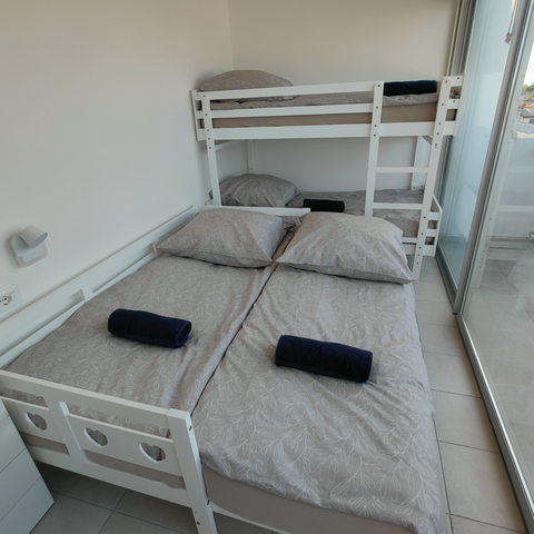 Kétszemélyes franciaágy és nagyméretű fa emeletes ágy van mindkét szobában, így szobánként 2 felnőtt és 2 gyerek, vagy 3 felnőtt és 1 gyerek tud aludni. A gyerekek szinte mindig azon versenyeznek, hogy ki alszik fenn az emeletes ágyon.